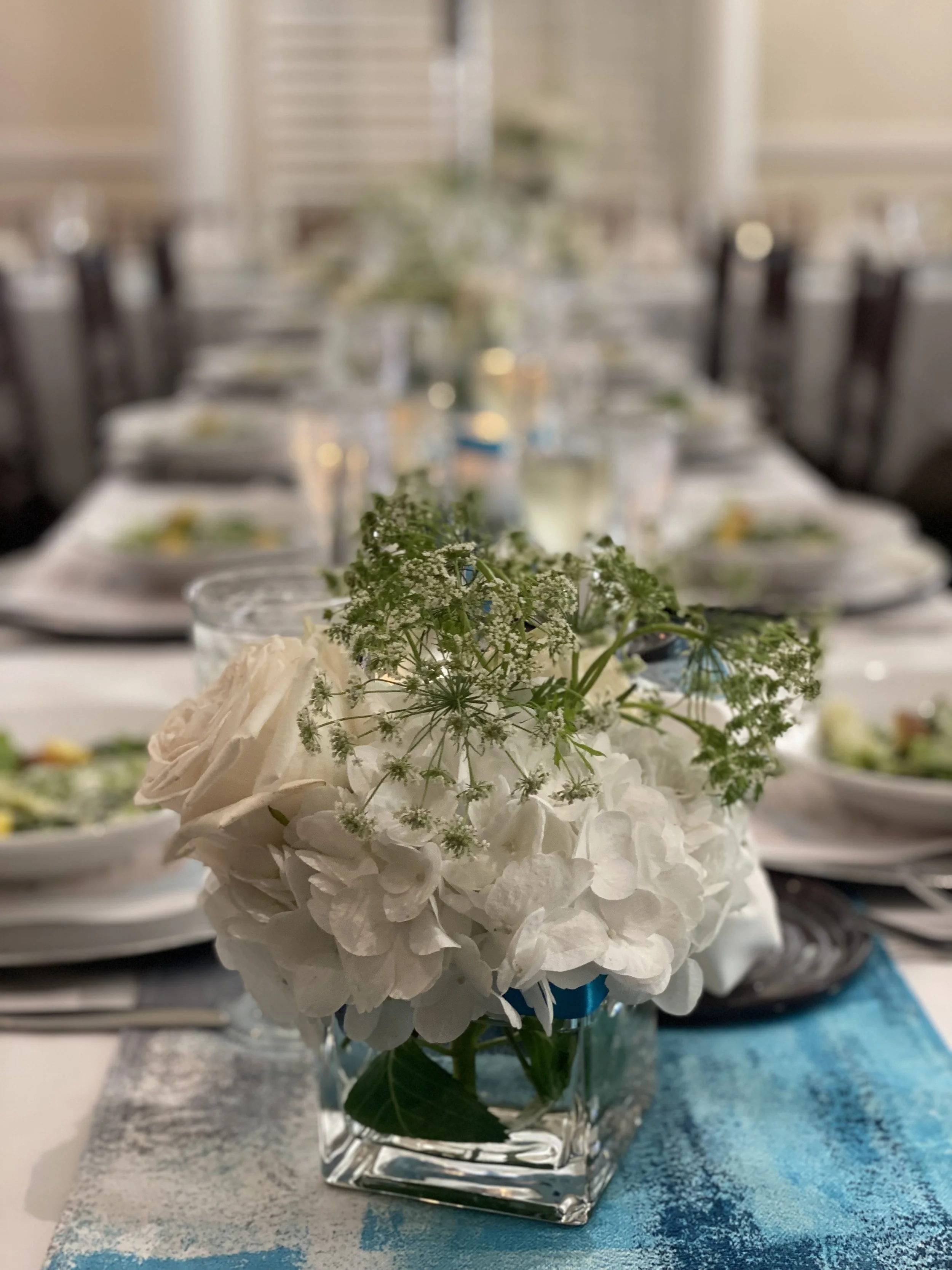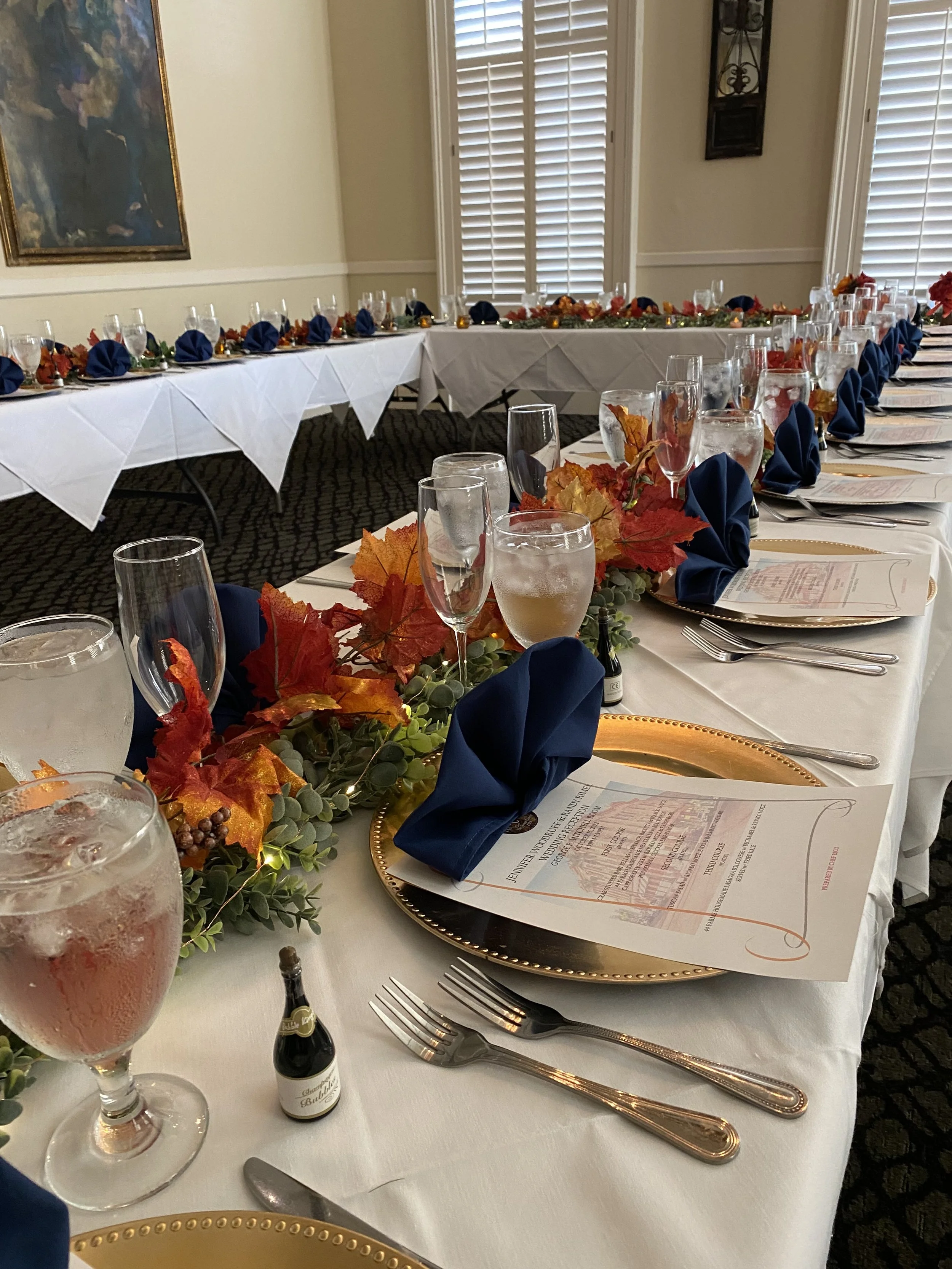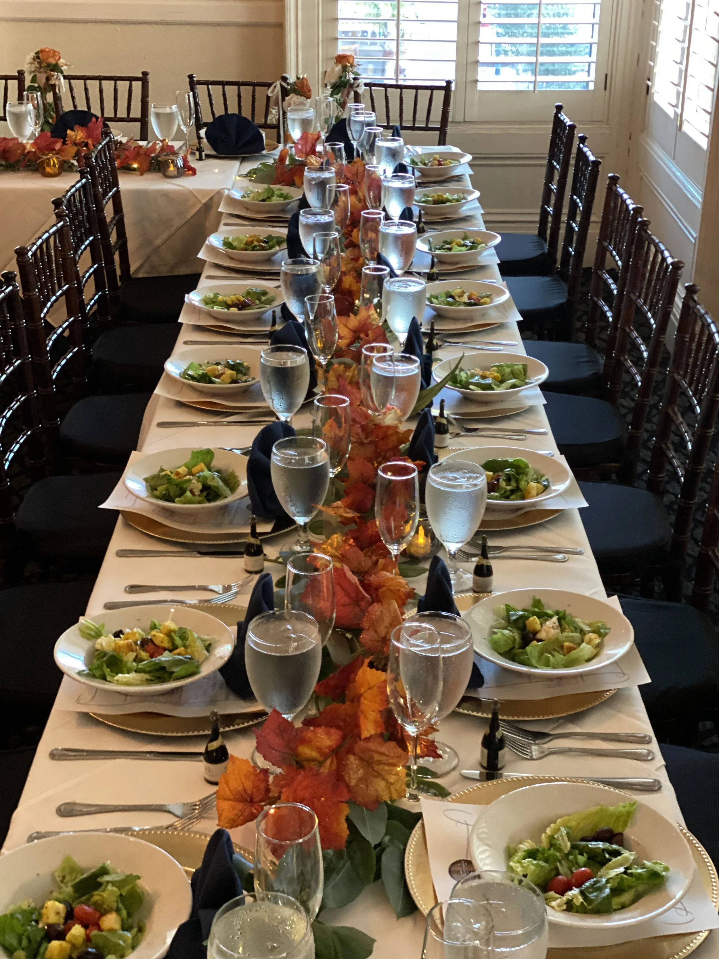 This is the upstairs banquet room. It holds a maximum of 75 people for a sit-down dinner and 120 people for cocktails and hors d'oeuvres. A room fee is required at the time of booking. For groups under 40 people the fee is $500. For groups of 40 and up, the fee is $1000. Prices for a formal buffet typically start at $60 per person for four courses. These packages include coffee, tea, and soda. Plated courses are an option with smaller parties, and the price per person may increase with this option. This price does not include tax, gratuity, or alcohol. Alcohol package prices vary based on the needs of your party.